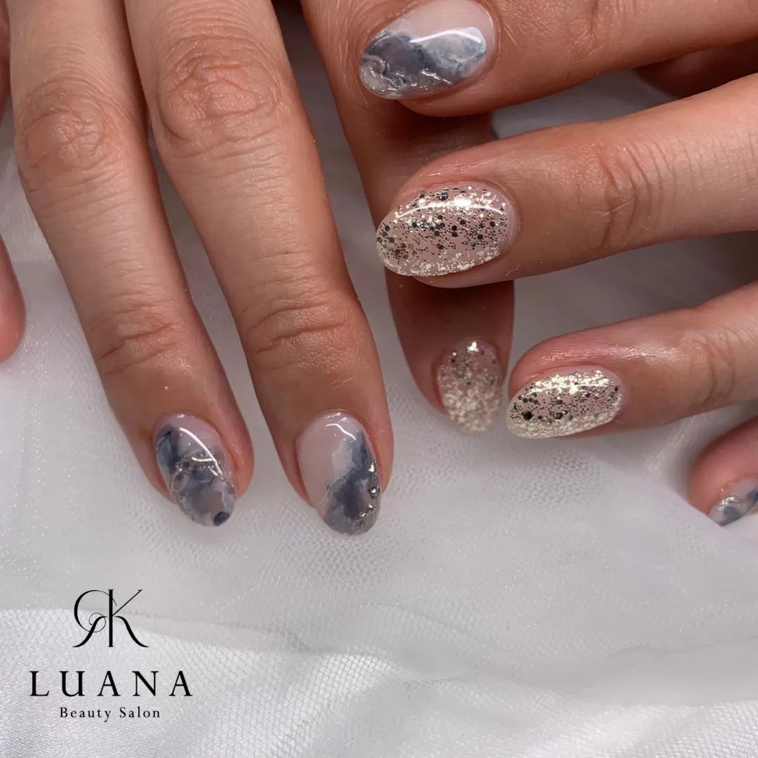 【inkネイル】 透け感のあるインクアート×ラメ シンプルだけど個性も出したい人におすすめくすみネイビーインクが大人っぽくて ラメとの相性も抜群です