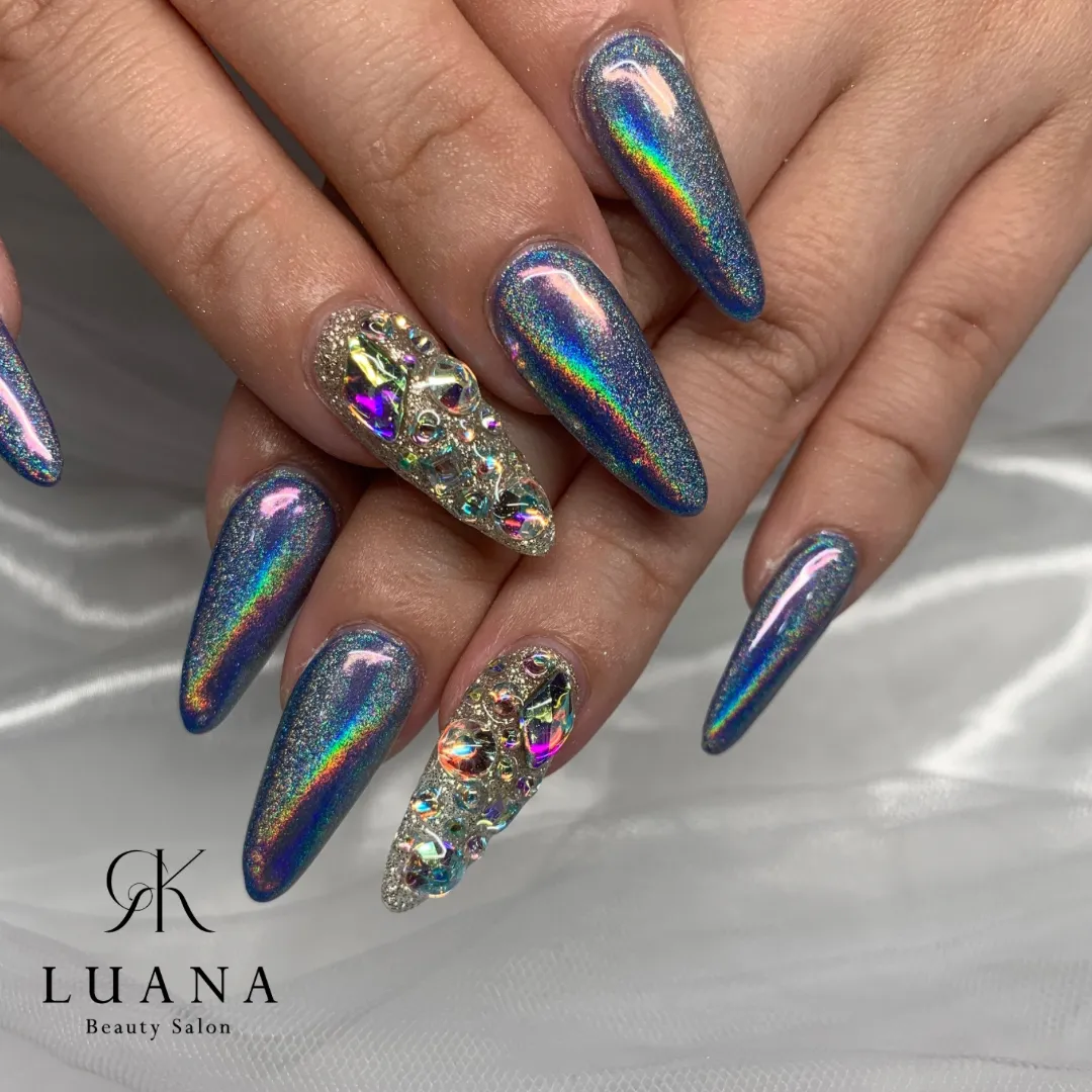 【ユニコーンネイル】 10本長さ出し ブルーベースにユニコーンのキラキラ ストーン埋めつくしでキラキラ 光の角度で色変わるのが可愛い