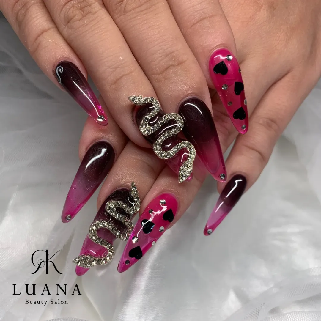 【ロングネイル】 ビビッドなピンク×ブラックグラデに 目を引くスネークパーツがドン!長さ出しだからこそ クリアネイルが、また可愛い派手でパンチのあるデザインが 好きな方におすすめ