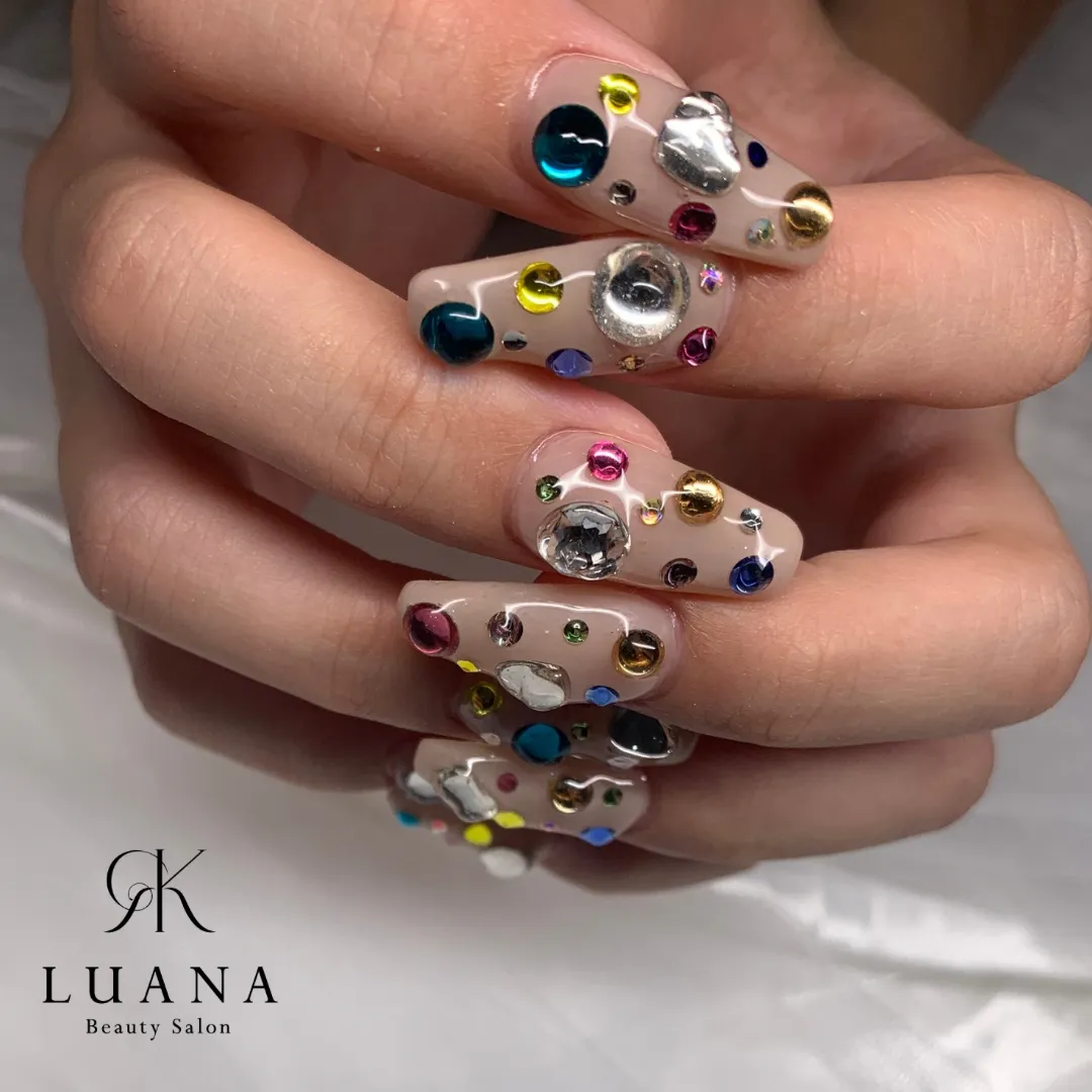 【ビジューネイル】 肌なじみカラーをベースに カラフルビジューデザイン シンプルじゃ物足りない方に おすすめデザイン